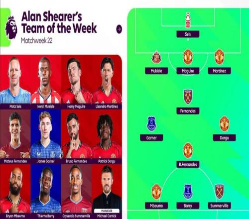 北京时间1月20日,英超官方晒出了希勒评选的第22轮比赛的最佳阵容,其中曼联有5名球员在列。